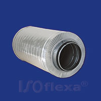 Schallgedämmter und wärmeisolierter Hochleistungsschalldämpfer mit 2 eingepressten Bundkragen-Steckverbindern mit Lippendichtung aus EPDM. Durch den Einsatz von hochwertigen Dämmmaterialien wird eine hohe Schallabsorption erreicht.